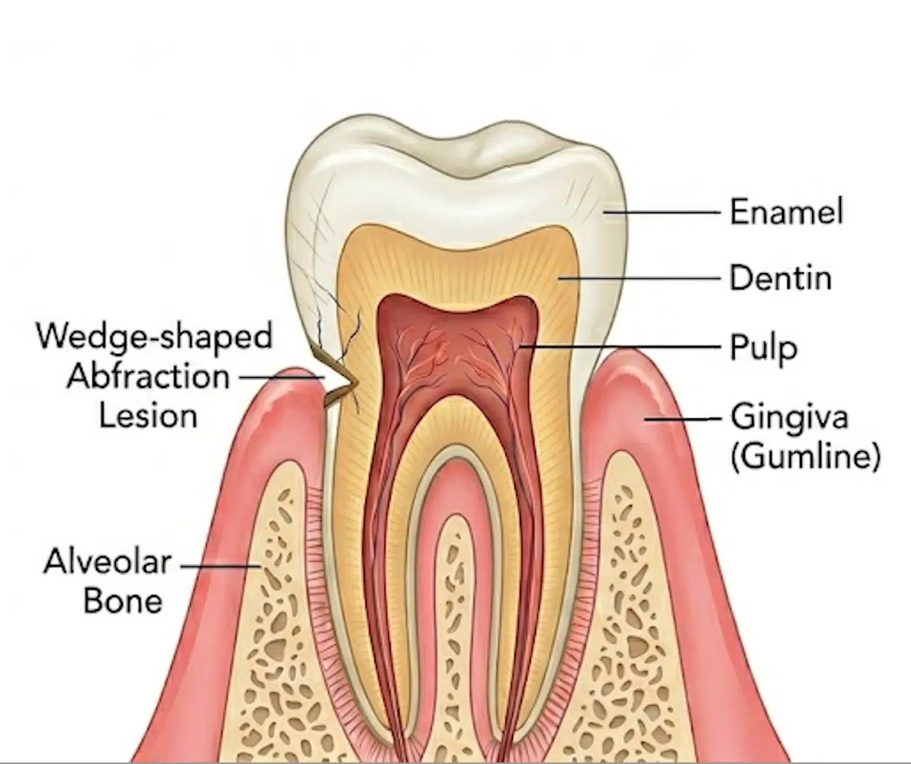 Over time, this flexing concentrates stress at that vulnerable area. Eventually, microscopic breakdown occurs in the enamel structure, leading to the wedge-shaped defects we recognize as abfractions.