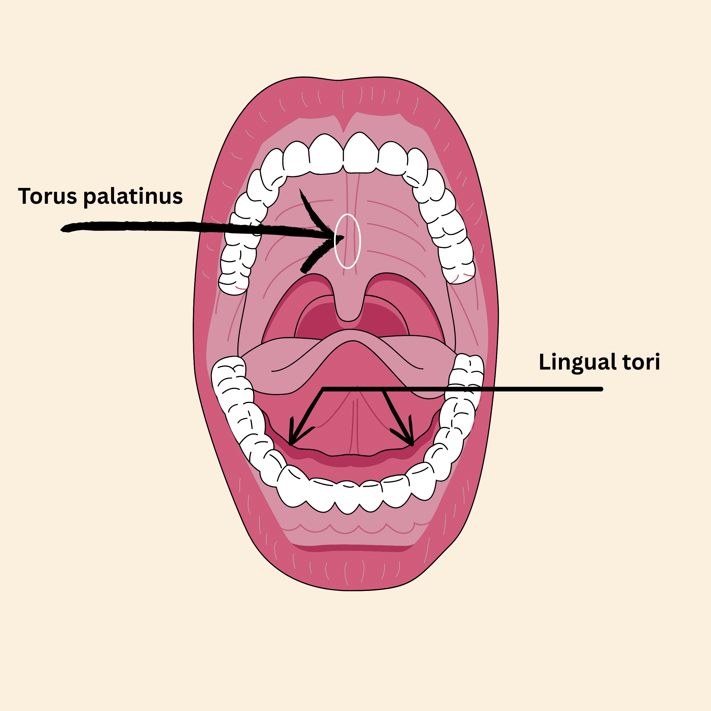 - Torus palatinus: A bony protrusion on the roof of the mouth.