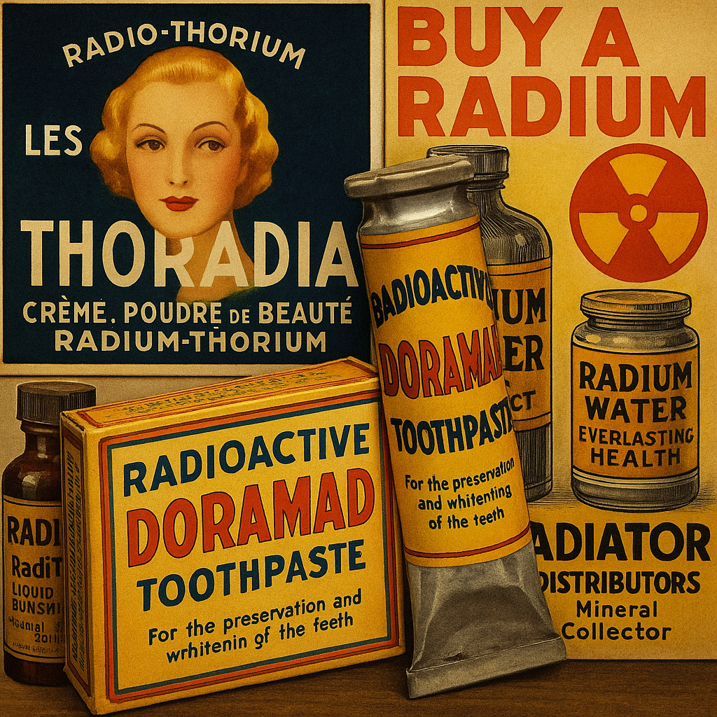 In the 1920s and 1930s, radioactivity wasn’t feared — it was fashionable. Companies jumped at the chance to sell “health” through radiation, from spa waters to cosmetics. Germany’s Doramad toothpaste, produced by Auergesellschaft, was among the most infamous. Its ads boasted that radioactive rays would invigorate gums and stop bacteria in their tracks. Another brand, Tho-Radia, sold radium-infused creams and powders as luxury beauty products.